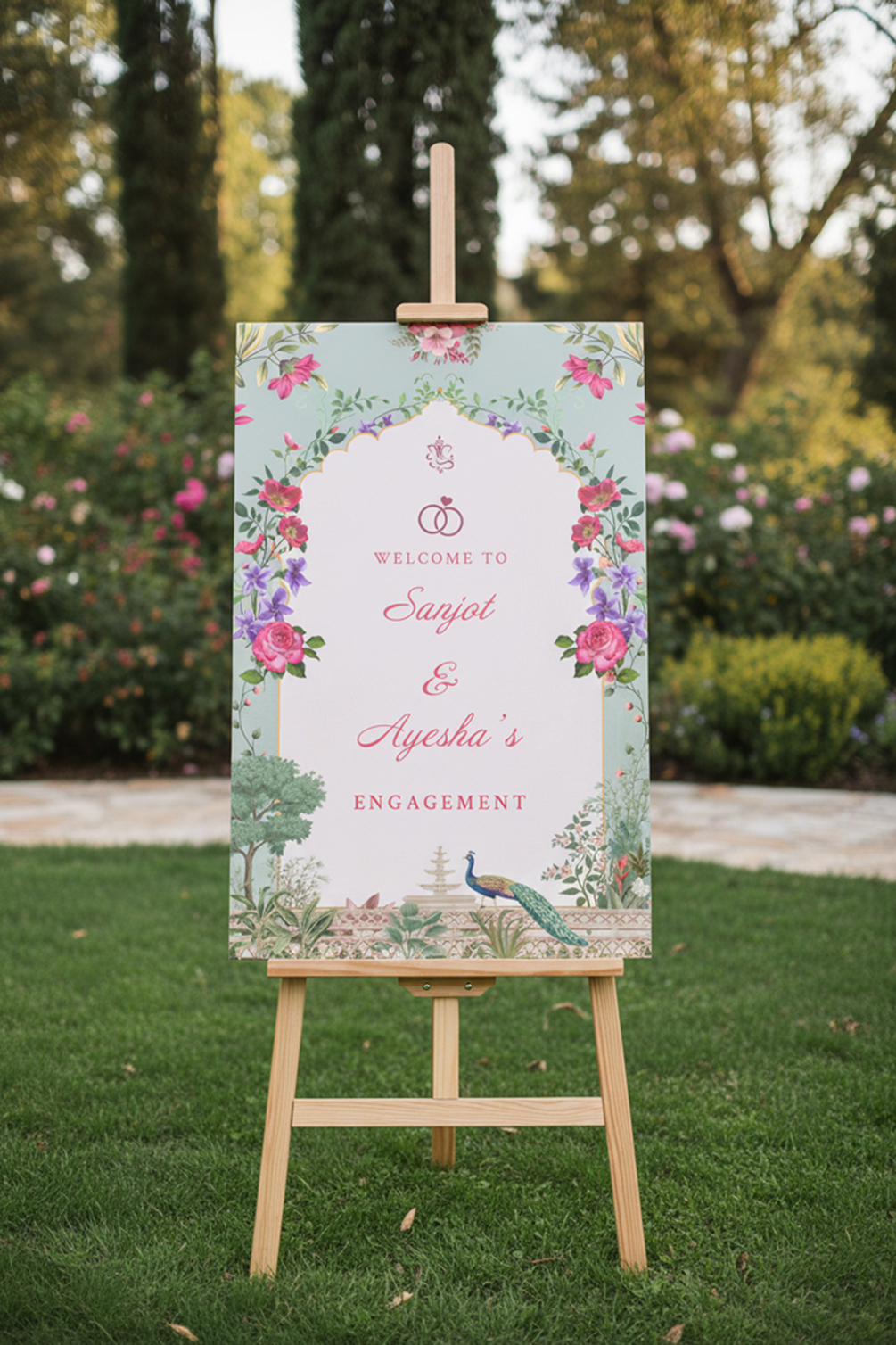 Perfect for engagement ceremonies, ring ceremonies, or pre-wedding events, this welcome sign looks stunning when displayed at the venue entrance or reception area. The clean central space ensures names and event text remain clear and readable from a distance.