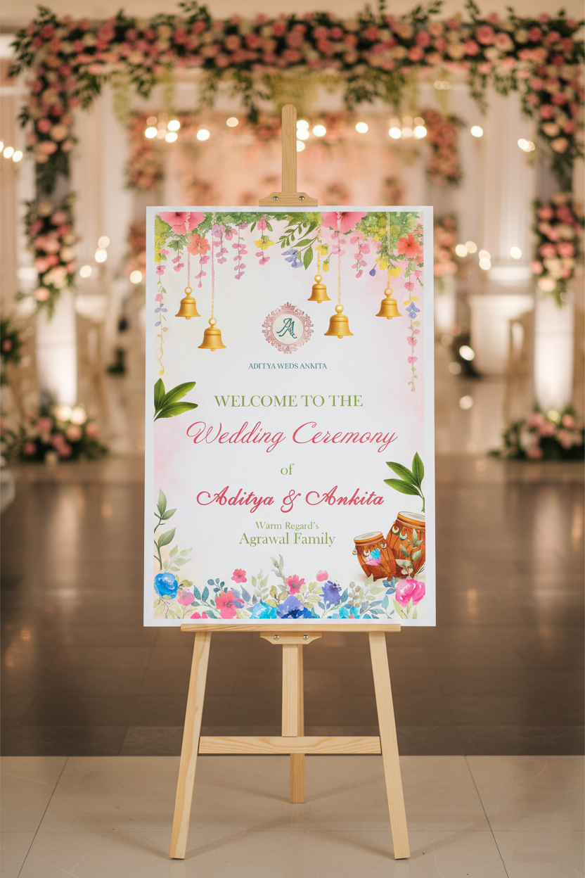 Designed in a premium 3×2 ratio, this printable wedding sign features soft pastel watercolor florals, hanging golden bells, traditional Indian décor elements, and graceful calligraphy typography—perfect for wedding ceremonies and venue entrances.
