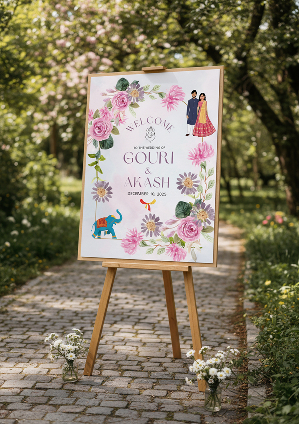This design is perfect for Indian weddings, fusion weddings, and luxury celebrations. The pastel floral palette combined with modern typography makes it ideal for wedding entrances, reception areas, and ceremony décor.