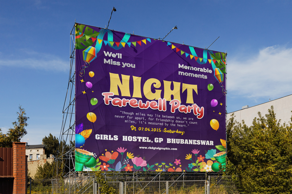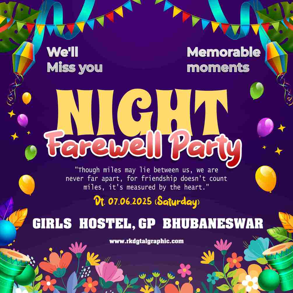 Make your farewell event unforgettable with this professionally designed PSD banner template. Perfect for schools, colleges, universities, hostels, and even workplace farewell parties, this 4x4 size editable design is easy to customize and print.